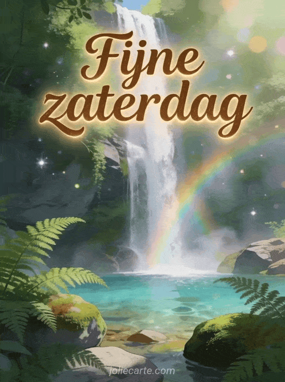 Deel een rustige fijne zaterdaggroet met een majestueuze waterval die in een kristalheldere poel stort, weelderige varens, bemoste rotsen en regenboognevel. Ontdek ook grappige fijne zaterdag, fijne zaterdag gifs of mooie goedemorgen zaterdag afbeeldingen.