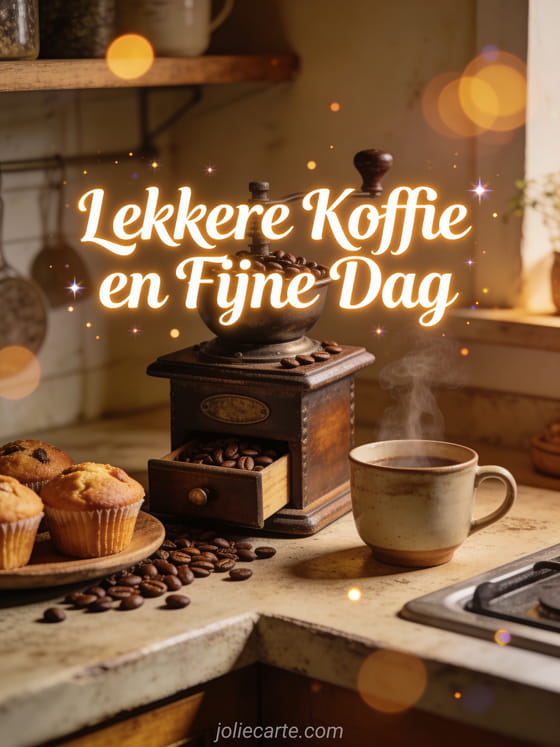 Deel ochtendwarmte met deze lekkere koffie en fijne dag kaart met een vintage koffiemolen, een dampende kop en versgebakken muffins. Ontdek ook een kaart van fijne dag goedemorgen familie afbeelding of goedemorgen fijne dag.