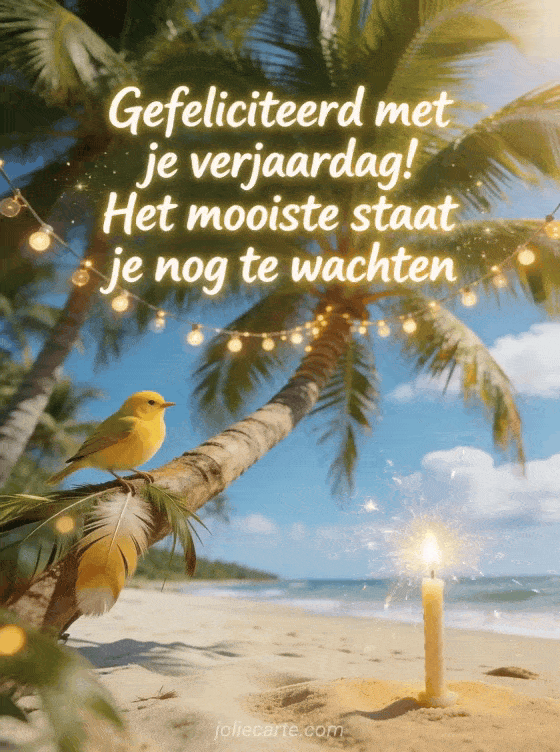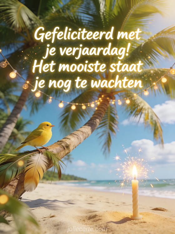 Stuur een leuke warme verjaardagsgroet met een wit zandstrand en kokospalmen. Een gele kanarie op een tak, een vonkenkaars in het zand en een festieve lichtslinger tussen de palmen. Bekijk ook origineel verjaardagsbericht of lief woordje voor verjaardag.