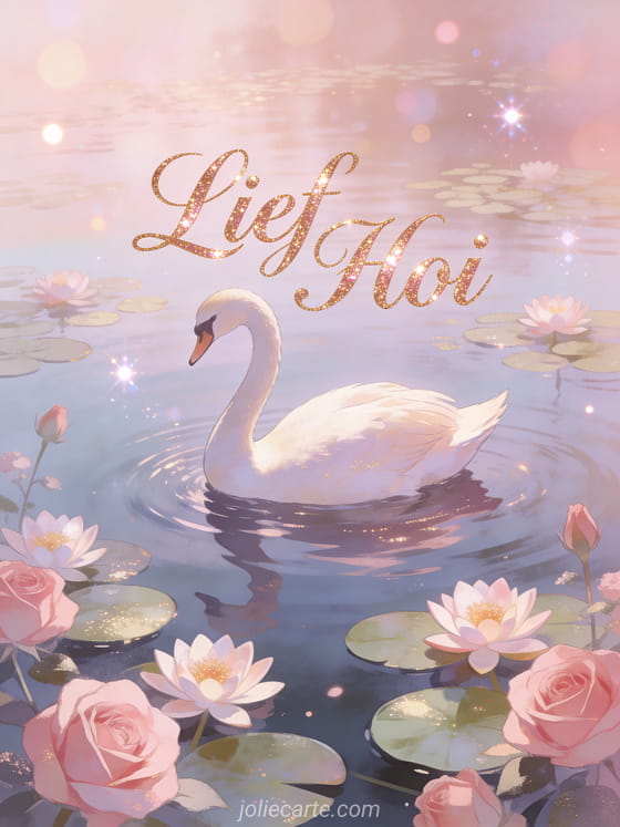 Stuur een verfijnde lief hoi kaart met een gracieuze zwaan die glijdt over een rustige vijver vol waterlelies en roze rozen in een sierlijke en serene sfeer. Ontdek ook een hoi fijne dag kaart of een bij hoi kaart of een hoi kuiken kaart.