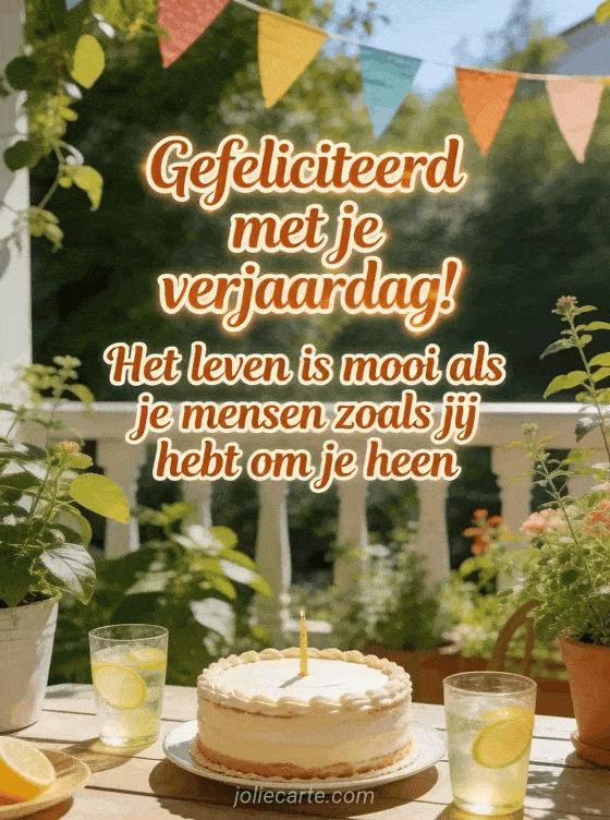 Stuur een lief gezellig verjaardagsberichtje met een zonnig terras vol groene planten. Een eenvoudige elegante taart, limonadeglazen en kleurige vlaggetjes creëren een ontspannen zomerse sfeer. Bekijk ook klein berichtje om iemand een gelukkige verjaardag te wensen.