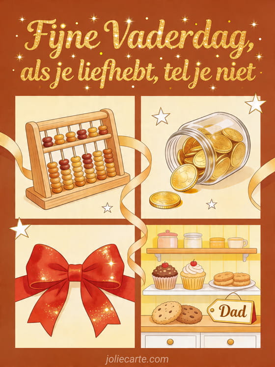 Vier papa met een warme geïllustreerde kaart die laat zien dat liefde niet telt, met een houten telraam, gouden munten, een rode cadeaustrik en zoet gebak. Het is een vrolijke manier om genegenheid te delen voor Vaderdag. Bekijk ook gelukkige vaderdag, kaart voor papa of Papa vaderdag afbeelding.