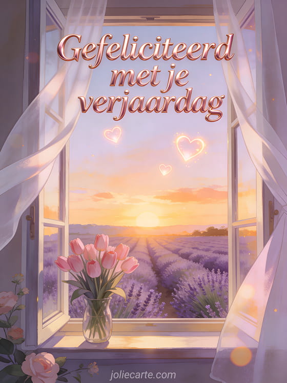Verras je geliefde met deze dromerige verjaardagskaart met een open venster op een lavendelveld bij zonsondergang. Ontdek ook een verjaardagskaart knuffelbeer of een liefdevolle verjaardagskaart.