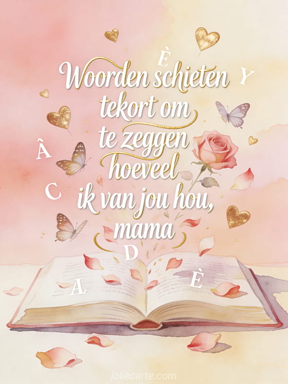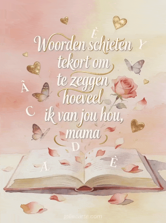 Stuur mama lieve woorden met deze poëtische moederdagkaart waarop letters uit een open boek opstijgen en veranderen in vlinders en rozenblaadjes. Bekijk ook lieve woorden voor moederdag of vrolijke moederdag feest.