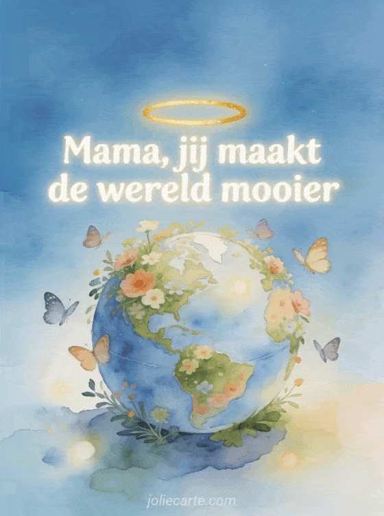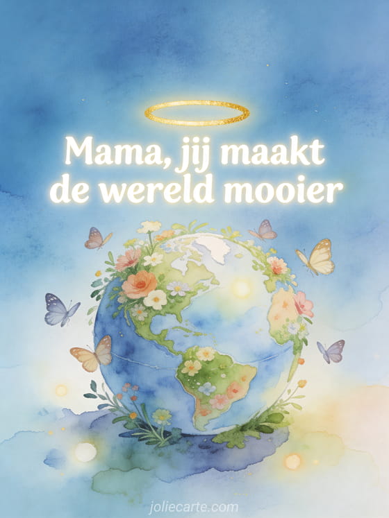 Stuur mama lieve woorden voor moederdag met deze poëtische kaart van een miniature wereldbol bedekt met bloemen en vlinders. Bekijk ook vrolijke moederdag feest of vrolijke moederdag.