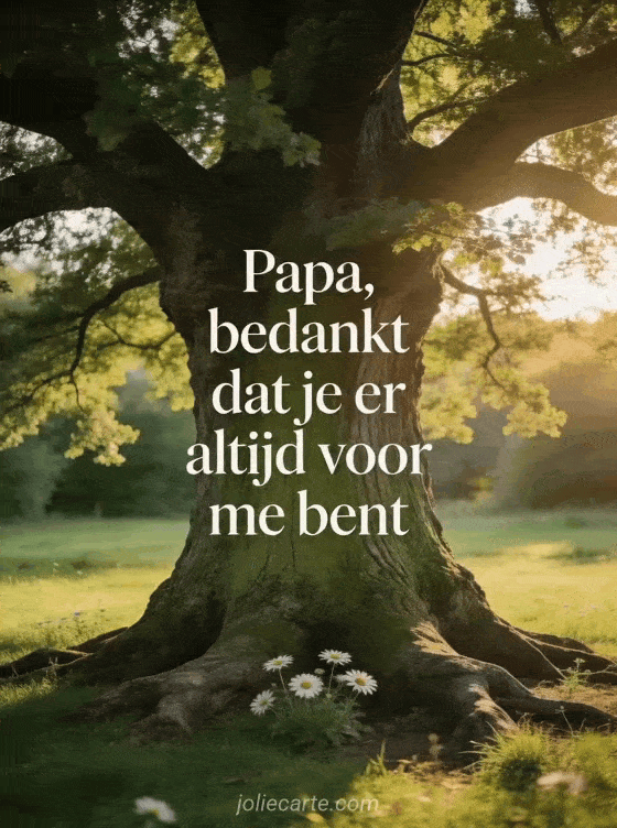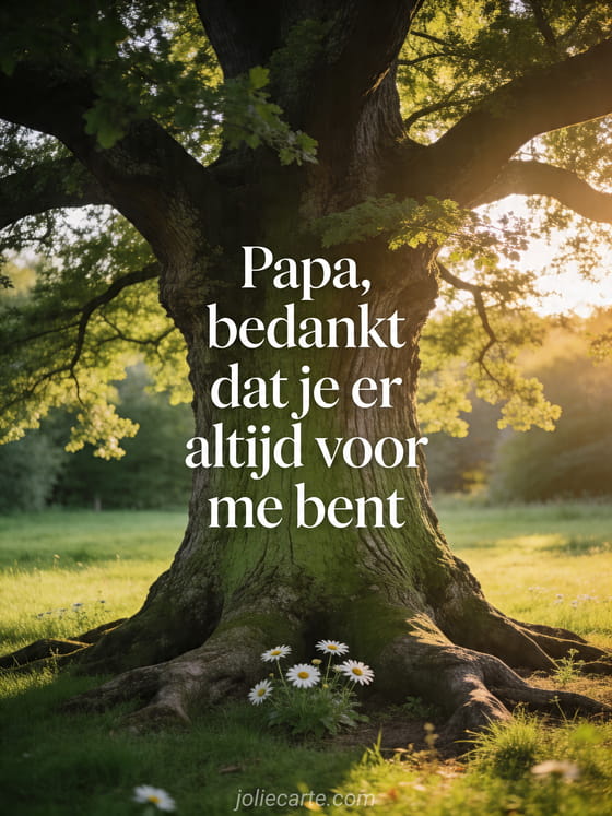 Deel lieve woorden voor Vaderdag met een sereen beeld van een eeuwenoude eik in een groene weide, gouden avondlicht en margrieten aan de voet. Ontdek ook een voorbeeld voor vaderdagkaart, een korte Vaderdag quote of fijne vaderdag lieve papa.