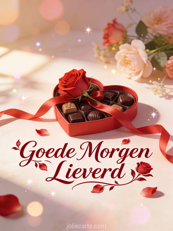 Stuur een passionele lieverd goede morgen kaart met een rode hartvormige doos chocolade en een enkele rode roos met zijden lint in warm ochtendlicht. Ontdek ook een foto goede morgen kaart of een bericht goede morgen kaart of een goede morgen citaat kaart.