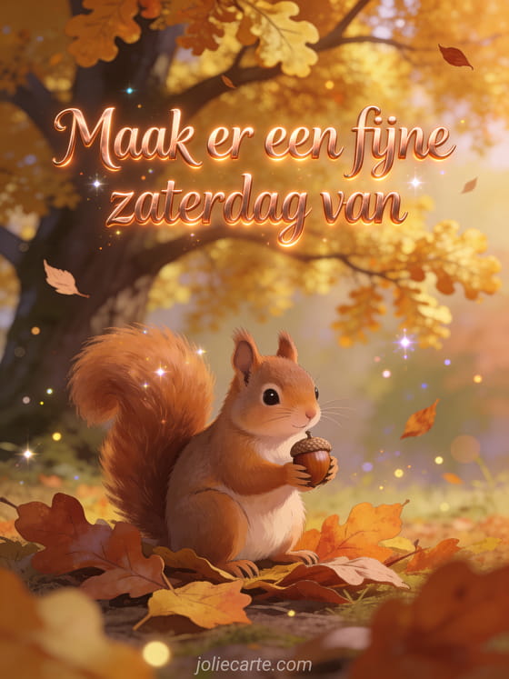 Deel een gezellige zaterdaggroet met een schattige eekhoorn die een eikel vasthoudt, gouden bladeren en zachte herfstgloed. Je kunt ook een fijne zaterdag dikke kus of een mooie fijne zaterdag afbeelding sturen.