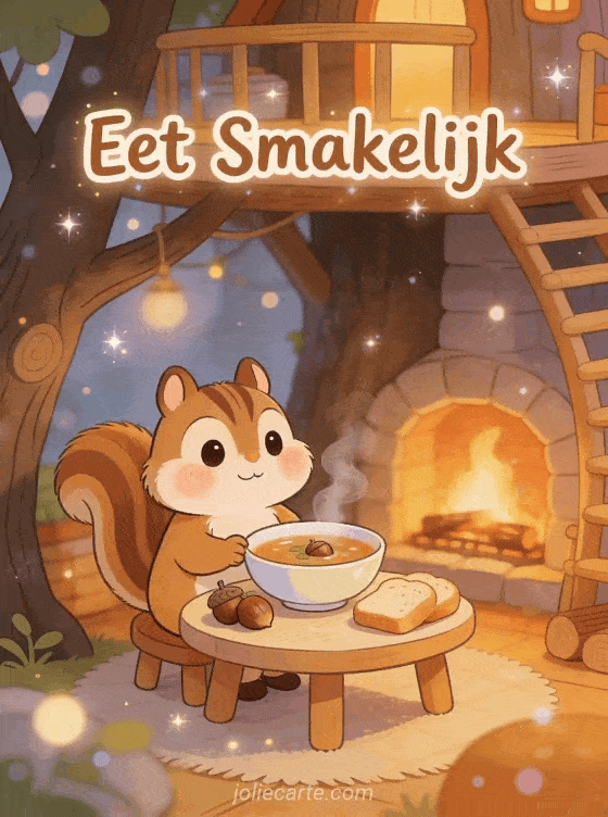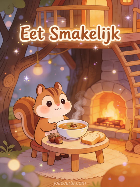 Stuur een warme eet smakelijk groet met deze gratis wenskaart. Een schattige chipmunk met bolle wangetjes zit aan een klein tafeltje met een kom eikelsoep en brood, in een gezellig boomhut interieur met een warme open haard en sprankelende lichtdeeltjes. Bekijk ook een afbeelding eet smakelijk of een eet smakelijk kaart.