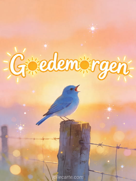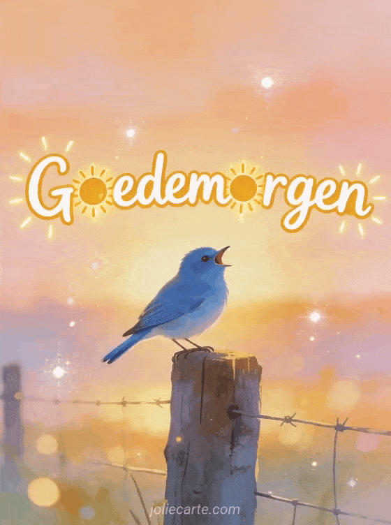 Stuur een Goedemorgen kaart met een zingende blauwe vogel bij zonsopgang om maandag vrolijk te beginnen. Bekijk ook moed goedemorgen maandag, maandag goedemorgen grappig en een fijne maandag.