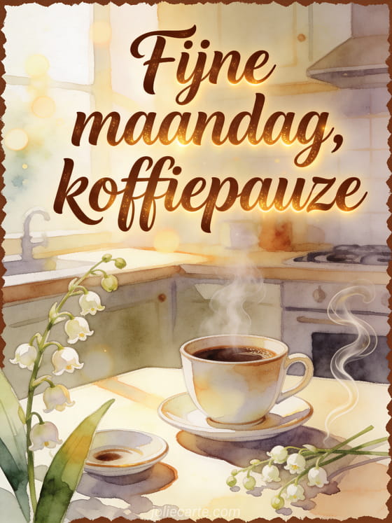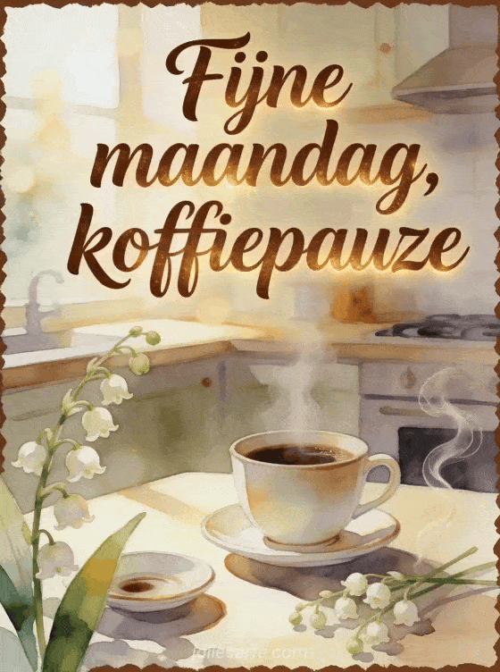 Begin maandag met een gezellige koffiegroet, mokkakleurige letters, een dampende kop, lelietje-van-dalen, een schoteltje en warm keukenlicht. Ontdek ook een goedemorgen maandag geanimeerde gif, fijne maandag met regen afbeeldingen of een fijne maandag kat gif.