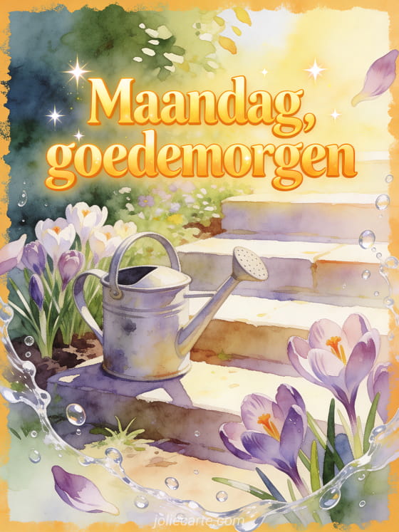 Deel een vrolijke maandagochtendboodschap met een kleine gieter, bloeiende krokussen en glinsterende waterdruppels op een heldere tuintrede. Stuur ook een fijne week fijne maandag gif, een goedemorgen maandag goedemorgen afbeelding of een fijne maandag geanimeerde afbeelding.
