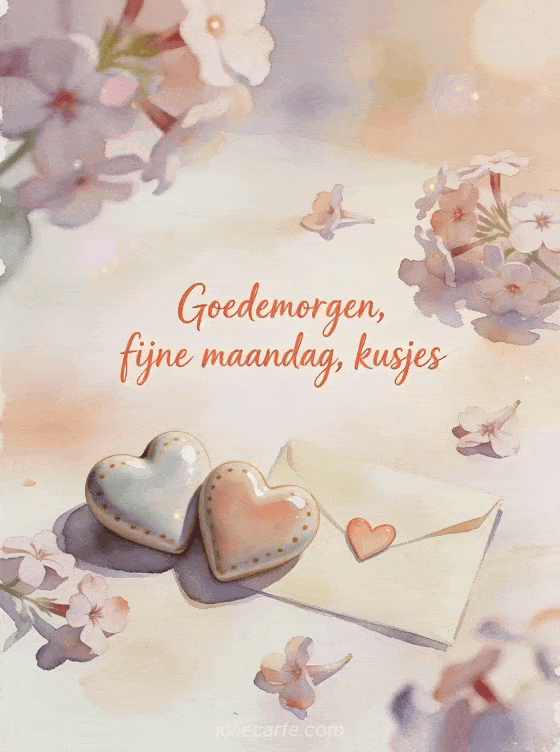 Stuur een liefdevolle groet voor maandagochtend met keramische hartjes, een kleine envelop met hartzegel en vlambloemblaadjes. Bekijk ook fijne maandag koffie gif, fijne maandag bloemige afbeelding of fijne maandag geanimeerde gifs.
