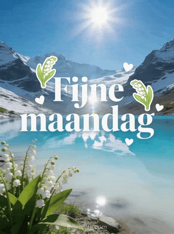 Deel een frisse maandagkaart met zuivere witte letters, lelietje-van-dalen, kleine witte harten, een melkblauw gletsjermeer en besneeuwde bergen in de zon. Je kunt ook grappige fijne maandag humor, een fijne maandag kat kusjes afbeelding of deze regenachtige fijne maandag afbeeldingen sturen.