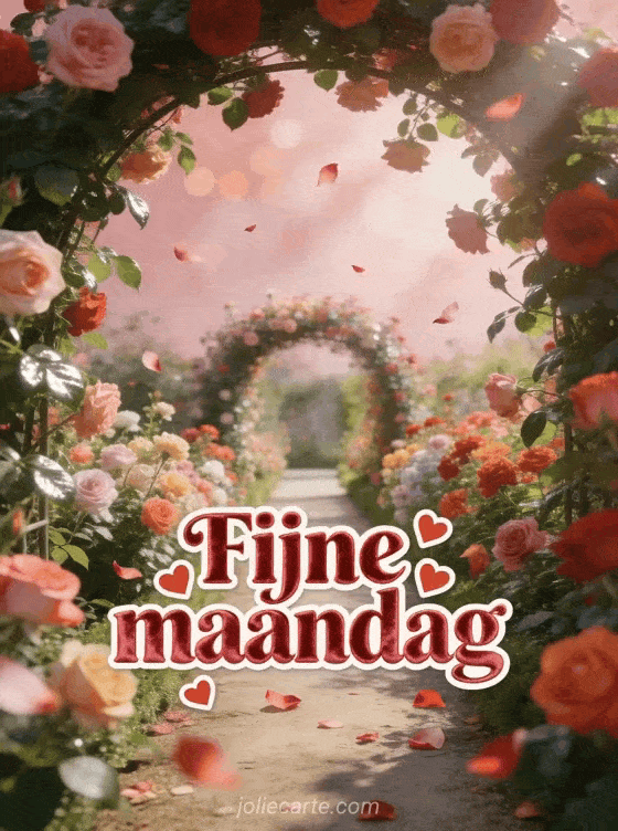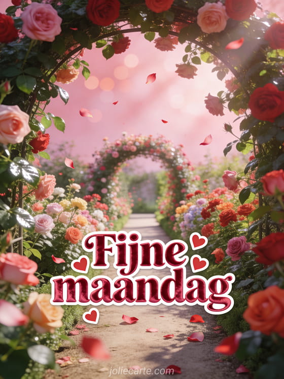 Deel een romantische kaart voor fijne maandag met rozig rode fluweelletters, kleine rode harten, rozenblaadjes en een weelderige rozentuin met een pad onder een boog van klimrozen. Ontdek ook deze goedemorgen maandag kaart, goedemorgen fijne maandag koffie of een fijne maandag fijne week gif.