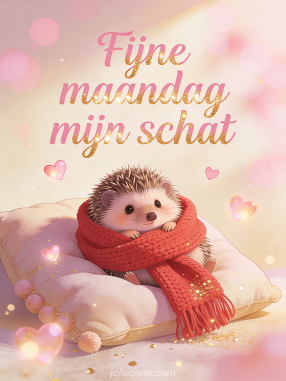 Stuur een teder fijne maandag aan je liefde met deze zoete romantische kaart met een schattige egel in een rode sjaal omringd door gloeiende hartjes. Ontdek ook positief fijne maandag positief of kaarten fijne maandag goede week.