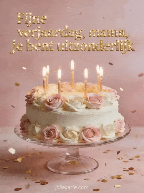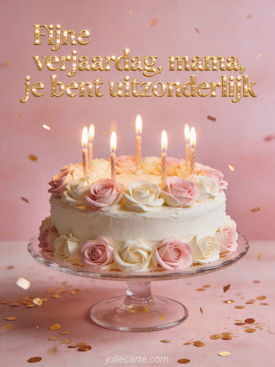 Deel een vrolijke verjaardagsboodschap voor je mama met deze feestelijke kaart met een taart vol roomrozen, gloeiende kaarsen en gouden confetti op een roze achtergrond. Ontdek ook mama verjaardag kaart, fijne verjaardag mama en ontroerende mama verjaardag tekst.