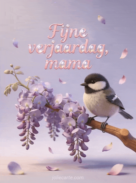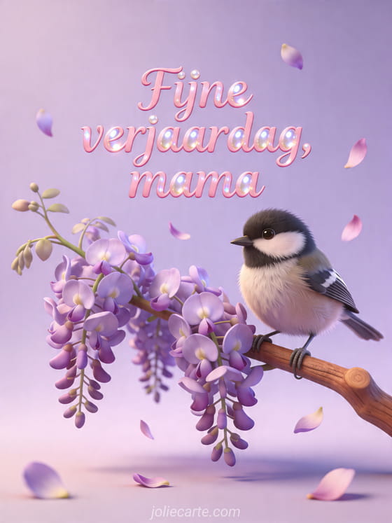Deel een lieve verjaardagswens voor je mama met deze tedere kaart met een kleine mees op een bloeiende tak van blauwe regen met vallende bloemblaadjes. Ontdek ook fijne verjaardag mama, ontroerende mama verjaardag tekst en tekening verjaardag mama.
