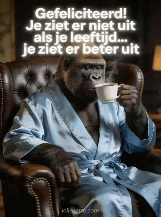 Deel deze humoristische kaart met een elegante gorilla in zijden badjas die koffie drinkt in een klassieke fauteuil. Bekijk ook grappig gefeliciteerd met je verjaardag, verjaardag kat humor en hilarische verjaardagsvideo.