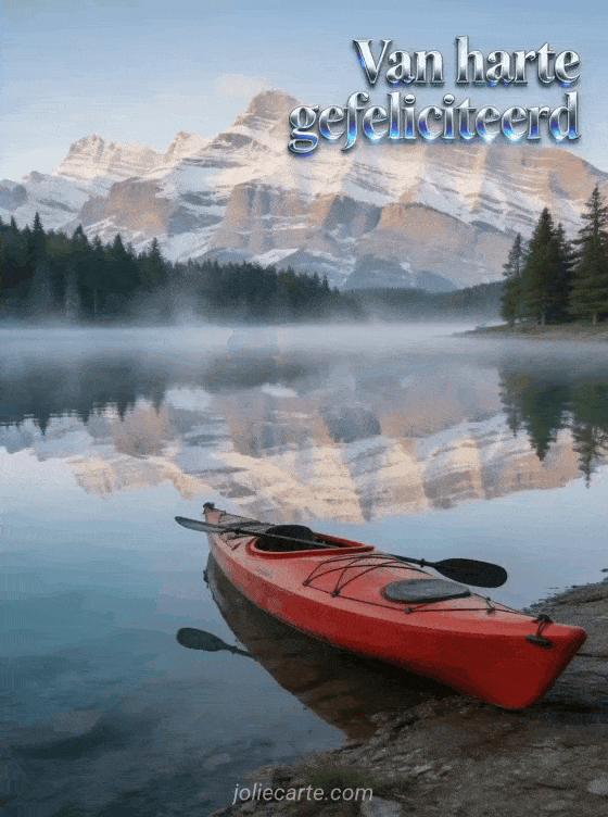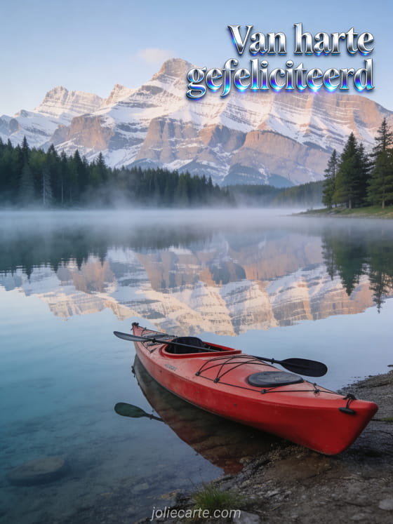 Een rode kajak aan de oever van een kristalhelder bergmeer in de vroege ochtend met perfecte weerspiegelingen van besneeuwde bergtoppen en lichte mist. Bekijk ook grappig gefeliciteerd verjaardag man of gelukkige verjaardag man.