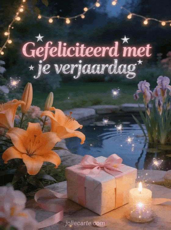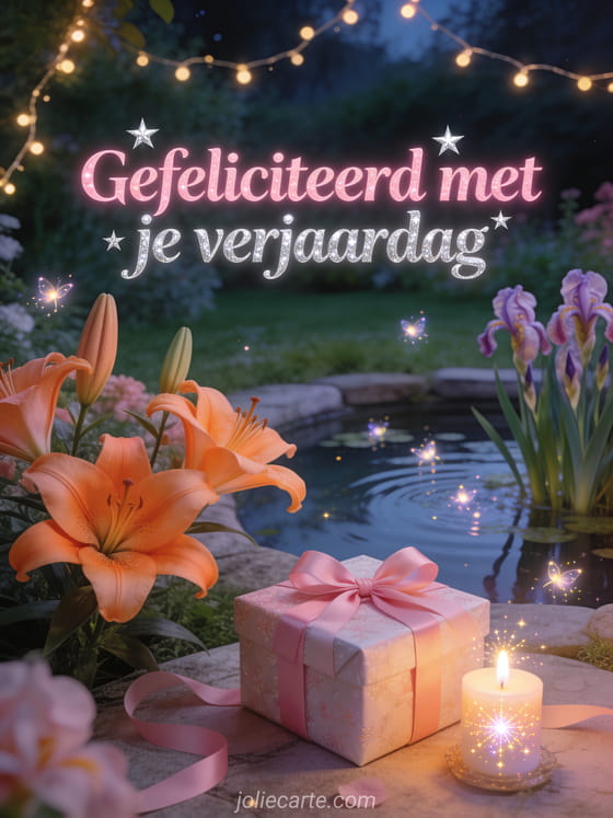 Verras een meisje met deze betoverende verjaardagskaart met oranje lelies bij een tuinvijver en glinsterende vuurvliegjes in de nacht. Ontdek ook een gratis verjaardagskaart kind of een foto verjaardagskaart voor kind.