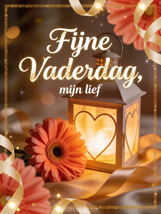 Stuur een romantische fijne Vaderdag mijn lief groet met een fotorealistische hartvormige lantaarn die gloeit naast koraalkleurige gerbera's, satijnen linten en sprankelende bokeh. Ontdek ook een gepersonaliseerde vaderdagkaart, vaderdag groeten of een vaderdagkaart voorbeeld.
