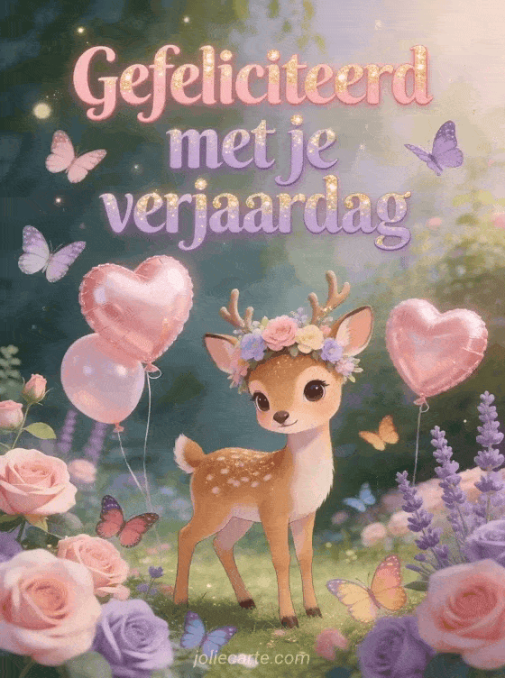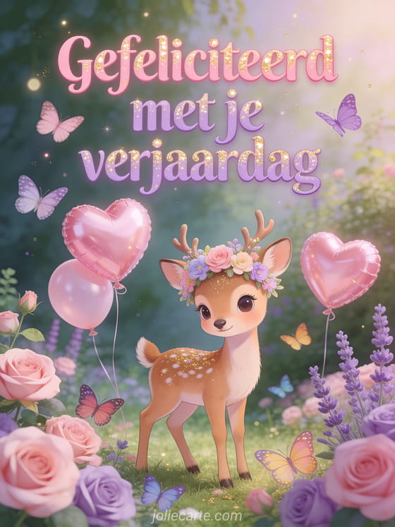 Verras een meisje met deze betoverende verjaardagskaart met een schattige hinde met een bloemenkroon in een betoverde tuin. Ontdek ook een afbeelding verjaardagskaart kind of een video gefeliciteerd baby.