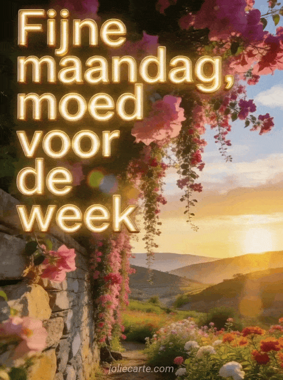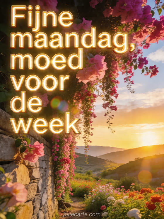 Geef iemand moed voor de week met deze stralende kaart waarop een bloemrijke vallei bij gouden zonsopgang te zien is, met roze bougainville langs een stenen muur en panoramische heuvels. Ontdek ook maandag goedemorgen grappig, een fijne maandag of goedemorgen fijne maandag fijne week kusjes.