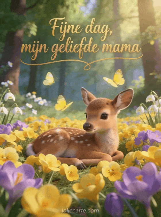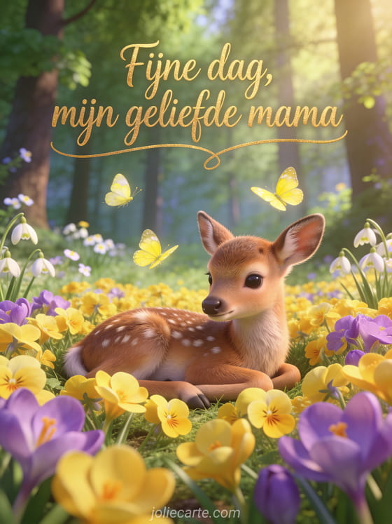 Verras je geliefde mama met deze betoverende lentekaart met een hertenjong tussen gele primula's en vlinders. Ontdek ook een geanimeerde moederdagkaart of een moederdag afbeelding.