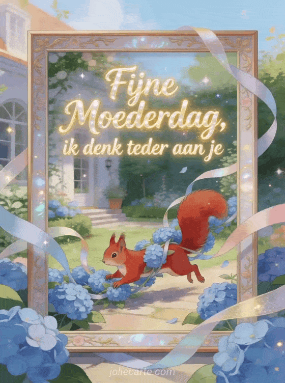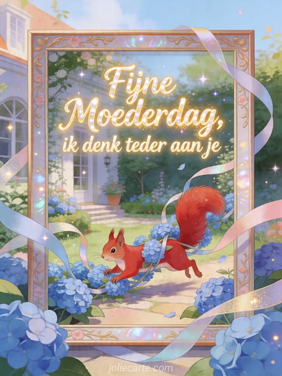 Deel een zachte Moederdaggedachte met een vrolijke geïllustreerde kaart vol blauwe hortensia's, linten en fonkelend daglicht. Ontdek ook Moederdag poëzie, een compliment voor Moederdag of hoe je je mama fijne Moederdag wenst.
