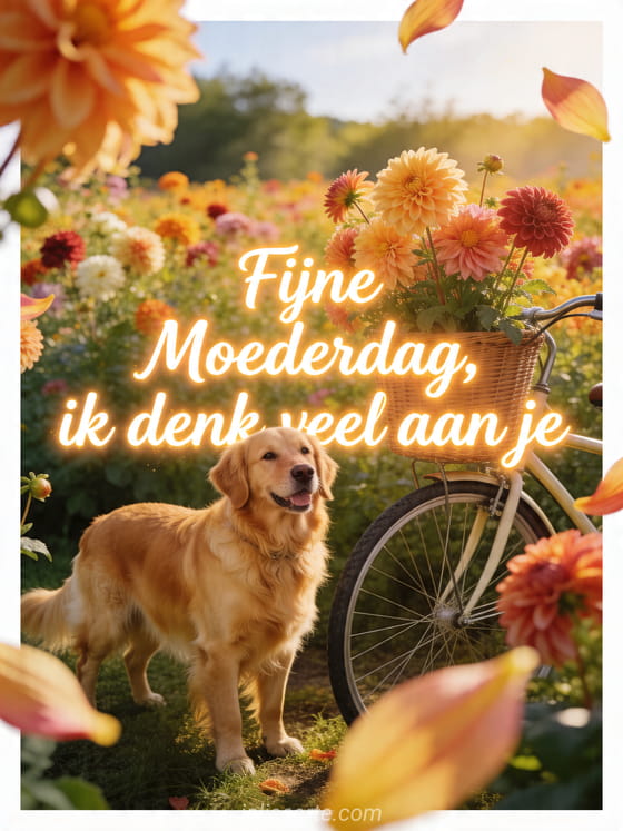 Deel Moederdag berichten op een zonnige realistische kaart met een Golden Retriever hond in een weide met dahlia's naast een vintage fietsmand. Bekijk ook plaatje voor Moederdag, een tekening voor Moederdag of lieve woorden voor Moederdag.