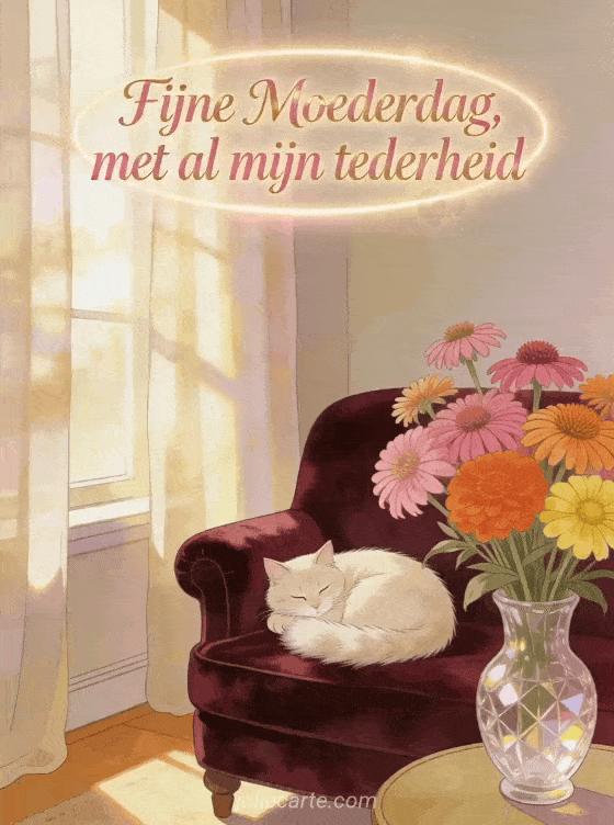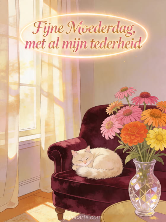Deel een warme scène in een fluwelen zitkamer waar een crèmekleurige kat naast zinnia's en een kristallen vaas rust in gouden daglicht. Stuur ook Moederdag gedicht, Moederdag poëzie of tekeningen voor Moederdag.