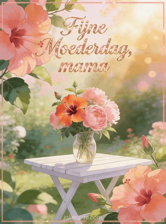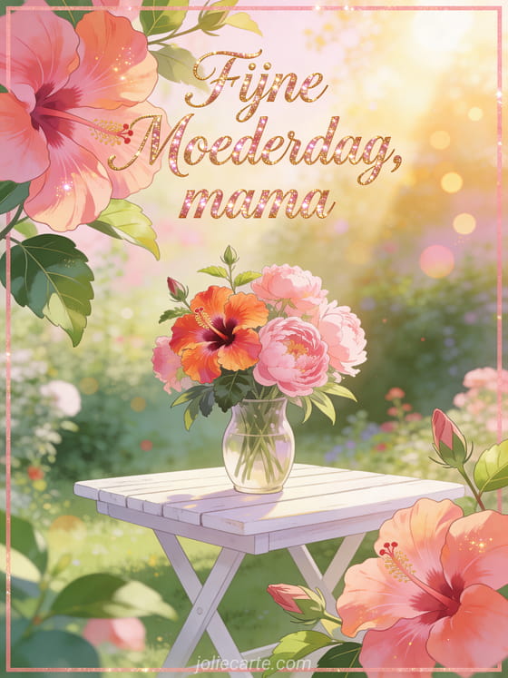 Verruk mama met deze prachtige lentetuinkaart met levendige hibiscus en roze pioenrozen in het gouden zonlicht. Ontdek ook moederdagkaarten of afbeeldingen voor Moederdag.