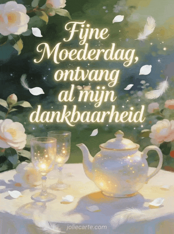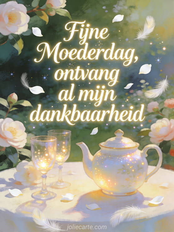 Deel een lichtvolle Moederdagkaart met een cameliatuintafel, porseleinen theepot, glanzend glaswerk en zachte bloemblaadjes. Stuur ook Moederdag woordspeling, fijne Moederdag mijn schoondochter of fijne Moederdag.