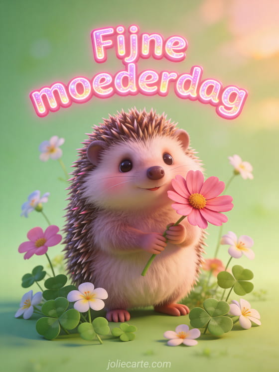 Verras mama met deze schattige moederdag gif van een egeltje dat een roze cosmos bloem vasthoudt, omgeven door madeliefjes. Bekijk ook moederdag foto's of voorbeeld moederdagkaart.