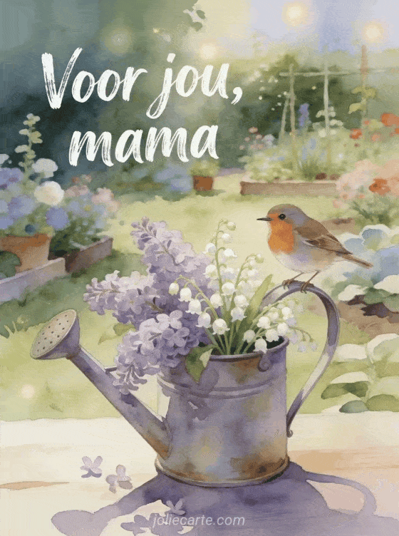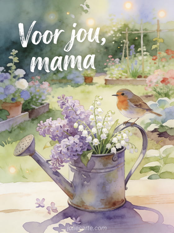 Verras mama met deze prachtige aquarelkaart met een mus op een vintage gieter vol seringen en lelietjes-van-dalen. Ontdek ook fijne moederdag of een moederdag wenskaart.