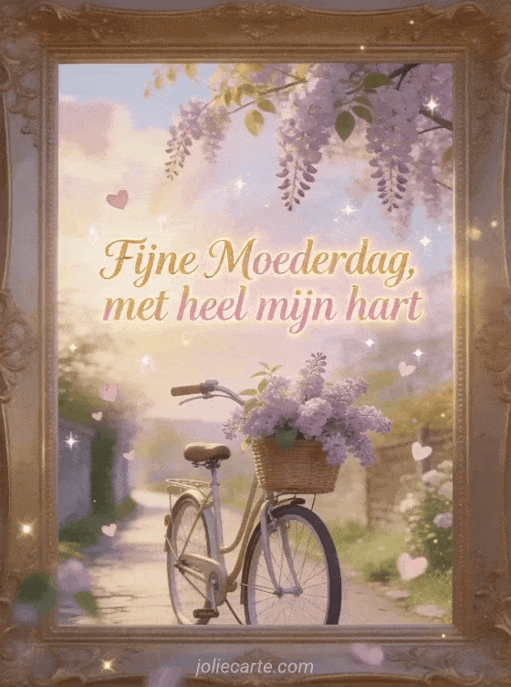 Deel een vrolijke Moederdagkaart met een charmant dorpsstraatje, een vintage fiets, geurende seringen en kleine zwevende hartjes. Ontdek ook Moederdag gedichten, rijmen voor Moederdag of een bloem voor Moederdag.