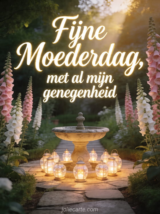Deel Moederdag poëzie op een elegante kaart met een zonnig tuinpad, hoog vingerhoedskruid, een stenen fontein en kristallen lantaarns. Bekijk ook compliment voor Moederdag, hoe je je mama fijne Moederdag wenst of fijne Moederdag voor een overleden mama.