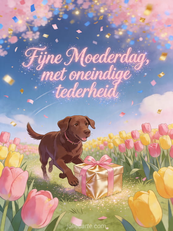 Deel Moederdag rijmpjes op een levendige geïllustreerde kaart met een tulpenweide, een chocolade labradorhond, een satijnen cadeau, lichtgevende confetti en vrolijke kleuren. Bekijk ook Moederdagberichten, afbeelding voor Moederdag of Moederdag kiekje.