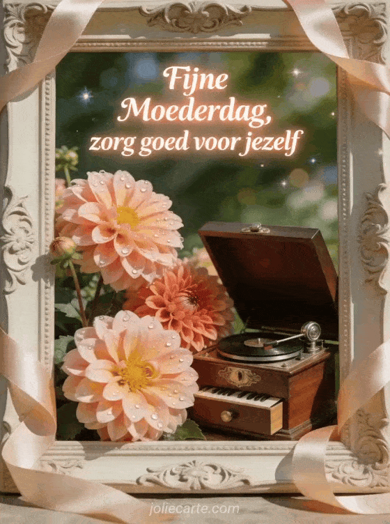 Deel een Moederdag tekst met gladde ivoorkleurige kalligrafie, een zachte perzikgloed en een fotorealistische open muziekdoos naast verse dahlia's. Satijnen linten en uitgesneden details maken deze kaart een liefdevolle manier om zorg goed voor jezelf te zeggen. Ontdek ook Moederdag vers, foto's voor Moederdag of Moederdag wensen.