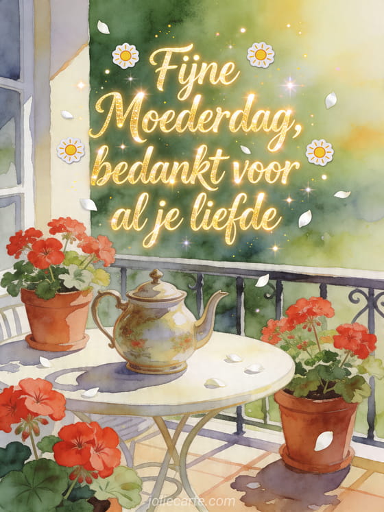 Deel een helder dankjewel voor Moederdag met een aquarelkaart vol rode geraniums, lentelicht en een warme balkonscène. Ontdek ook foto's voor Moederdag, Moederdag wensen of een Moederdag tekening.