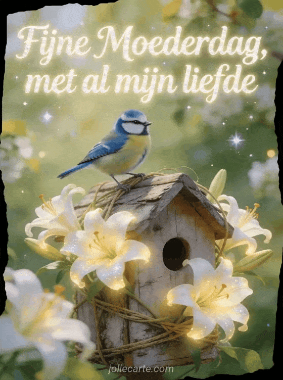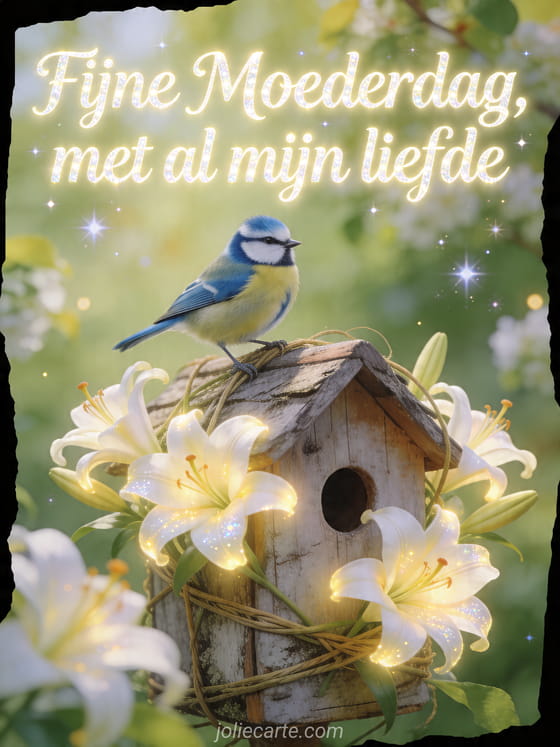 Deel een liefdevolle Moederdagkaart met een pimpelmees, een rustiek vogelhuisje omwikkeld met daglelies en fris boomgaardlicht. Ontdek ook tekst voor Moederdag, Moederdaggedichten of teksten voor Moederdag.