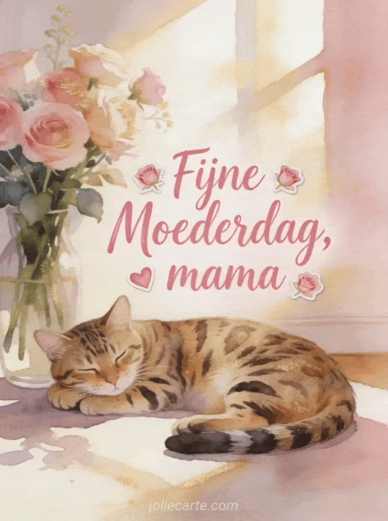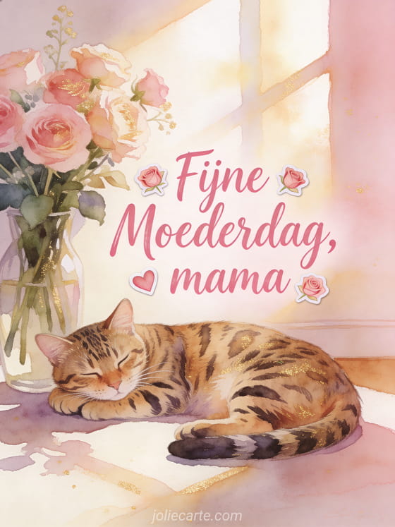 Verras mama met deze prachtige moederdag wenskaart met zachte roze aquarelkalligrafie en een Bengaalse kat naast geurige anjers. Ontdek ook moederdagbericht fijne moederdag of fijne moederdagdag.