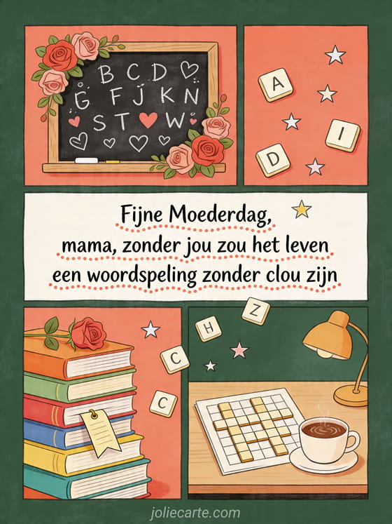 Deel een geestige Moederdagcollage met schoolbord, boeken, rozen, kruiswoordraadsel, warme chocolademelk en speelse letterblokjes. Stuur ook fijne Moederdag mijn schoondochter, fijne Moederdag of Moederdag.