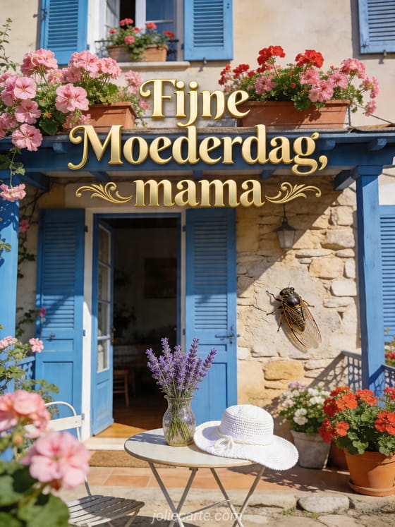 Vier mama met een zonnige Provençaalse veranda, blauwe luiken, roze geraniums, lavendel op een ronde tafel en mediterraan licht. Stuur ook Moederdagtekeningen, gedichten voor Moederdag of Moederdagafbeeldingen.