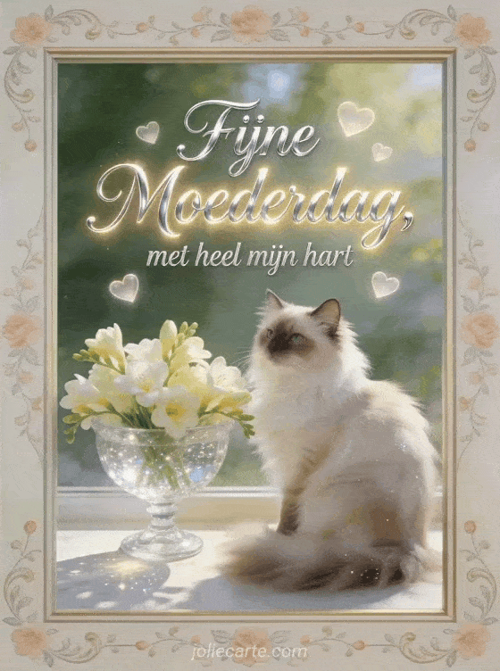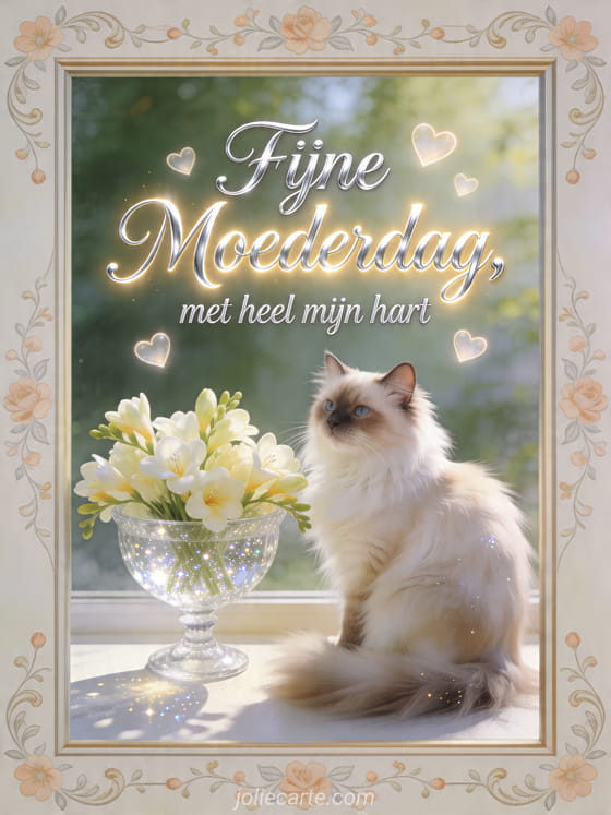 Deel een tedere Moederdagafbeelding met zilveren letters, verse fresia's en een elegante Turkse angora kat naast een kristallen schaal. Deze kaart brengt een warme boodschap aan een bijzondere moeder. Ontdek ook moederdagwens aan mijn dochter, moederdag doosje met lieve woordjes of moederdag liefdestekst.
