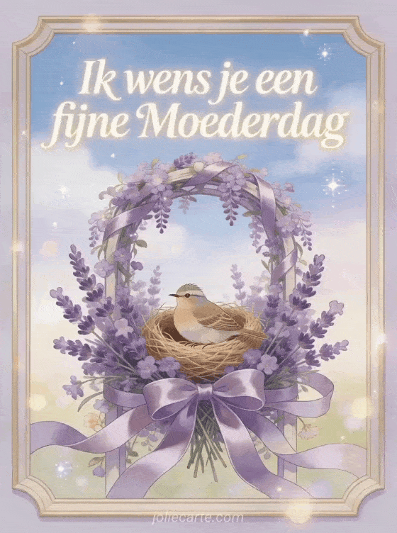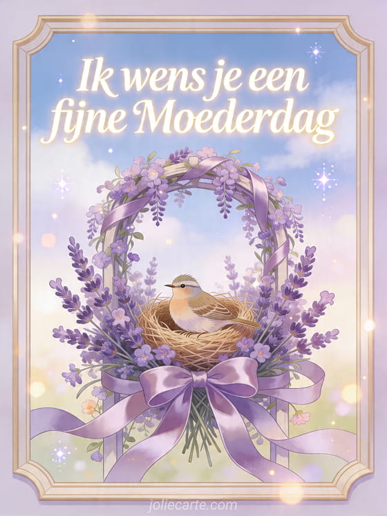 Deel een vrolijke Moederdagkaart met ivoorkleurige letters, een geïllustreerde lavendelboog, een kneunest tussen paarse bloemen, satijnen linten en subtiele glans. Ontdek ook een Moederdagtekening, goedemorgen en fijne Moederdag of versjes voor Moederdag.