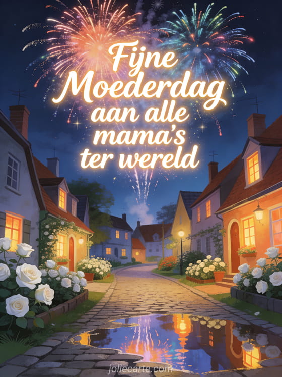 Stuur dit warme moederdagbericht voor alle mama's ter wereld met een prachtige panoramische dorpsscène verlicht door vuurwerk. Bekijk ook kaart voor moederdag of moederdag kaart gratis downloaden.