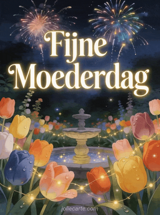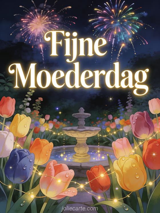 Stuur deze prachtige moederdagkaart met bloemen en vier moederdag met een magische nachtelijke tuin vol kleurrijke tulpen en vuurwerk. Bekijk ook een moederdagkaart mama of een originele moederdagkaart.