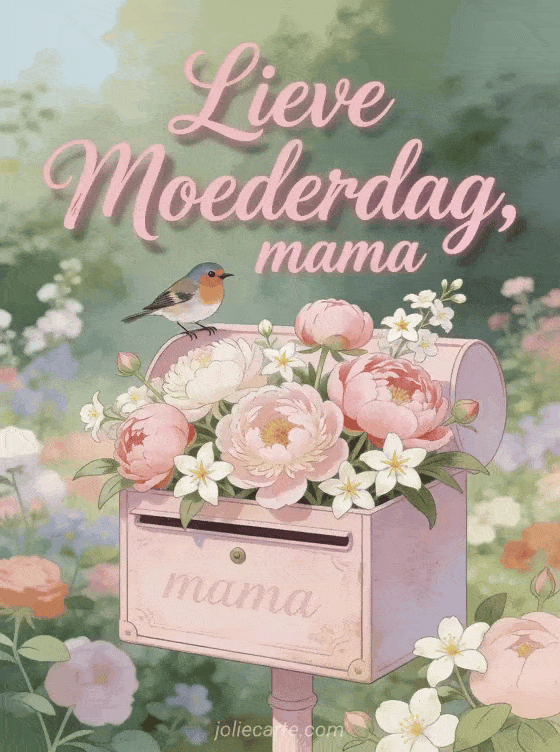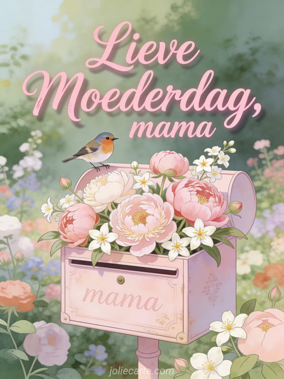 Verruk mama met deze elegante kaart met een putter op een pastelroze vintage brievenbus vol pioenrozen en jasmijn. Ontdek ook een originele moederdagkaart of een moederdag kaart gratis.